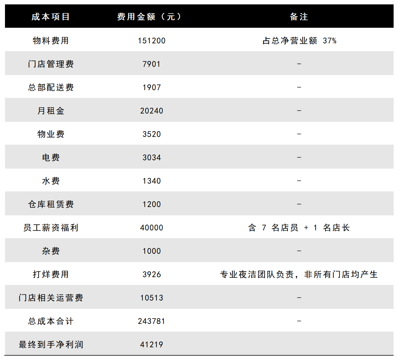 以堂食取外卖合计28。5万元的总净停业额计较,加盟商需承担的成本包罗:15。12万元物料费用(霸王茶姬物料占比凡是为37%)、7901元门店办理费、1907元总部配送费、20240元月房钱、3520元物业费、3034元电费、1340元船脚、1200元仓库租赁费、4万元员工薪资福利(含7名伙计+1名店长)、1000元杂费、3926元打烊费用(由专业夜洁团队担任,员工不参取)、10513元门店相关运营费,最终到手净利润为41779元。