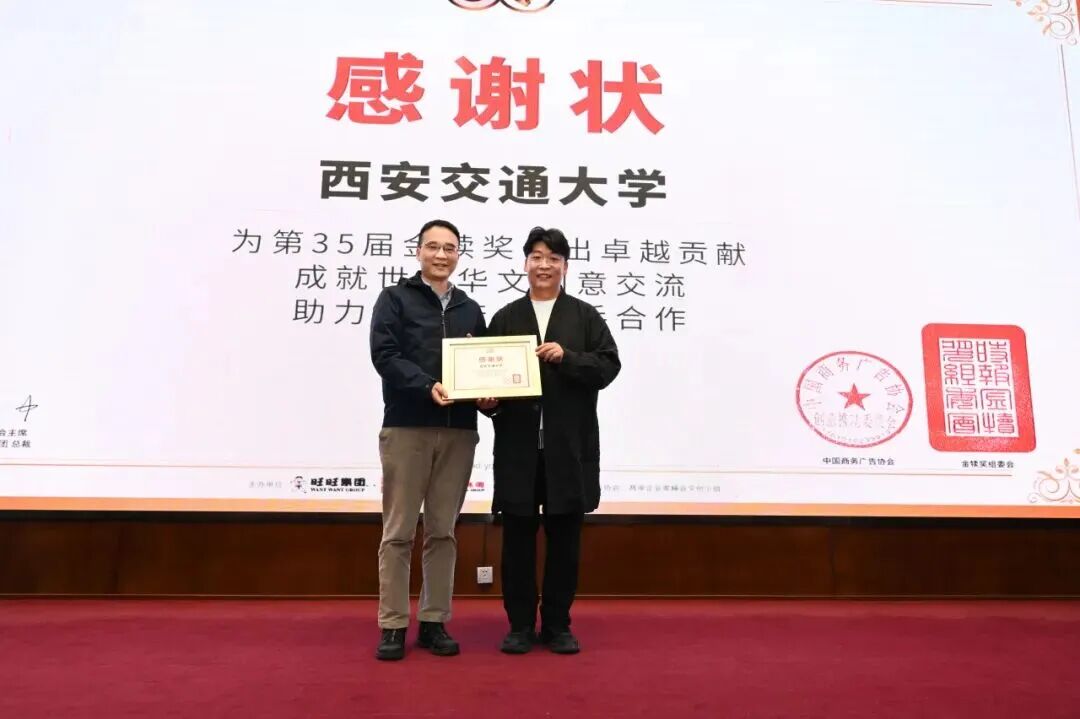 周智秘书长向西安交通大学颁布感激状,感激学校对金犊的悉心护航,新学院做为承办单元代表学校接过了这份荣誉。