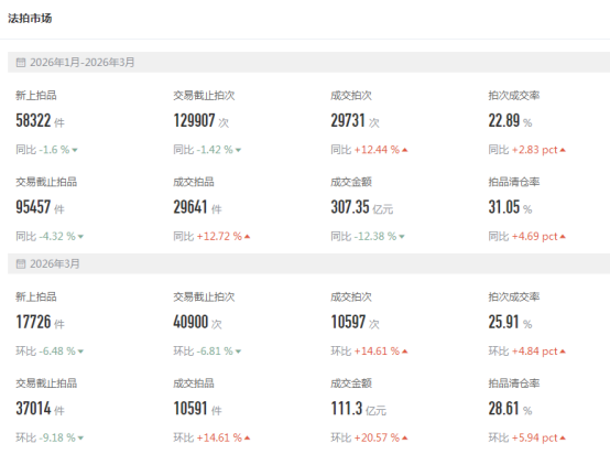 2026年一季度全法律王法公法拍市场各类法拍房源累计挂拍数量22。5万套,同比添加3。5%,房源累计拍次共30。6万次(统一标的物可能存正在一拍、二拍等多次拍卖),最终成交拍品数量为4。3万套,同比增加5。2%,清仓率18。9%(成交拍品/买卖截止拍品),总成交金额579。1亿元,同比下降10。3%。各类法拍房源成交均价4864元/㎡,同比下降5。9%,平均折价率为72。6%。(更多演讲内容,点击完整版)3月,全法律王法公法拍市场挂拍各类法拍房源数量8。7万套,环比下降13。8%,同比增加8。9%;最终成交拍品数量为1。5万套,环比增加17。1%,同比增加27。9%,清仓率17。8%,总成交金额206。7亿元,同比增加3。2%。各类法拍房源成交均价4885元/㎡,平均折价率为75。5%。(更多演讲内容,点击完整版)